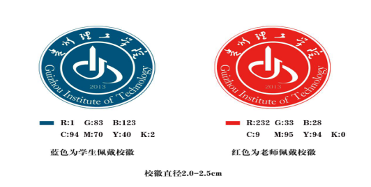 徽章为教职工和学生佩戴的圆形证章,证章印有规范的校名标识;教职工徽章为红底白字,学生徽章为蓝底白字。